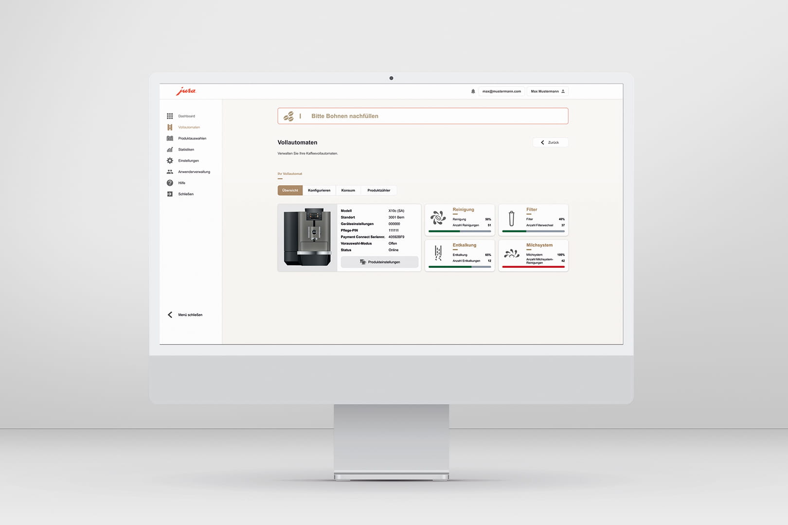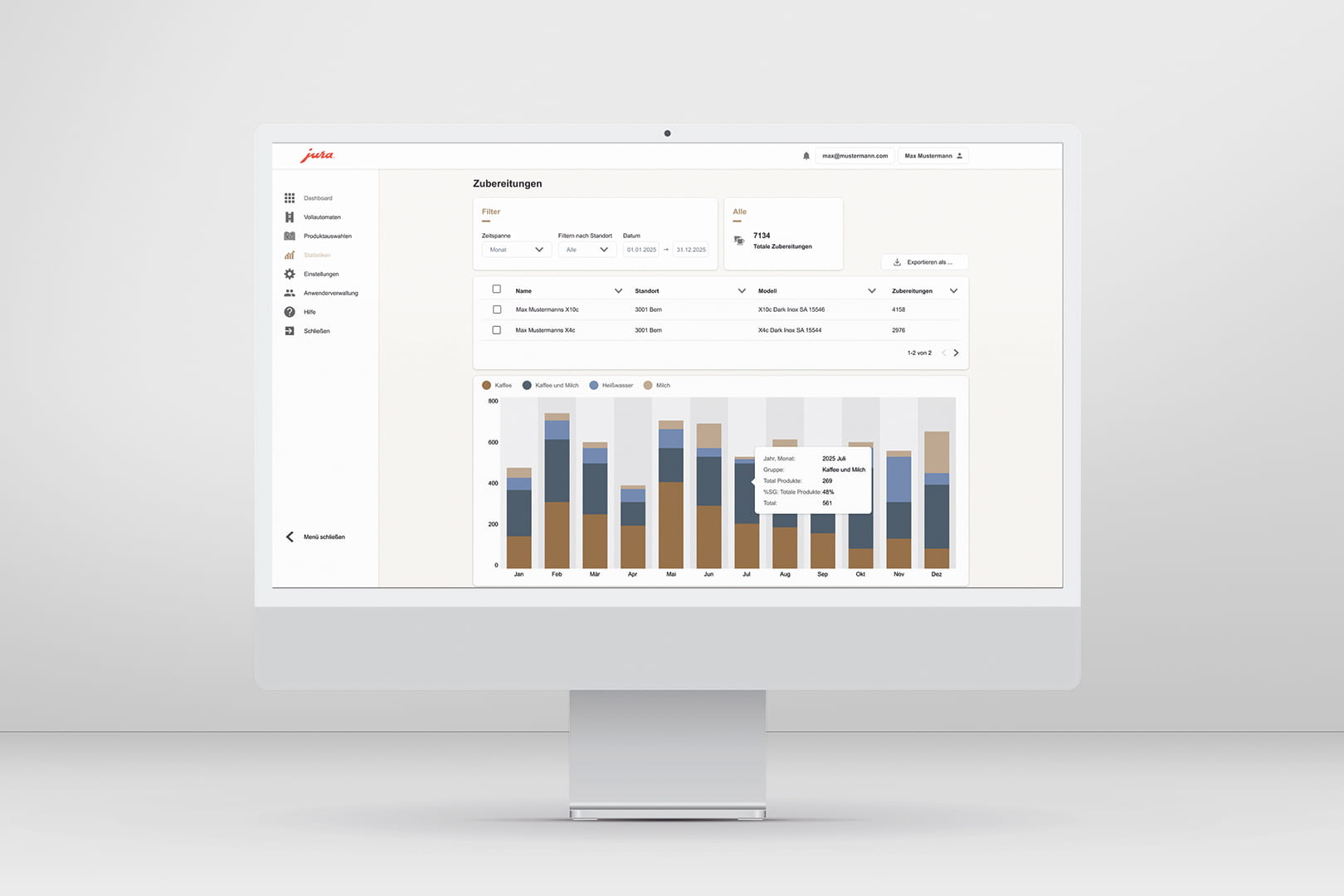 Pocket Pilot surveille les machines à café automatiques télémétriques de JURA en temps réel et visualise leur état directement sur le tableau de bord. Des notifications push et par e-mail informent automatiquement des besoins de maintenance, des conseils d'entretien et des pannes - ce qui permet d'éviter les pannes à un stade précoce. La visualisation claire dans le tableau de bord permet de prendre des décisions précises sur la base de données et garantit des processus stables ainsi qu'une disponibilité durablement élevée des machines entièrement automatiques.